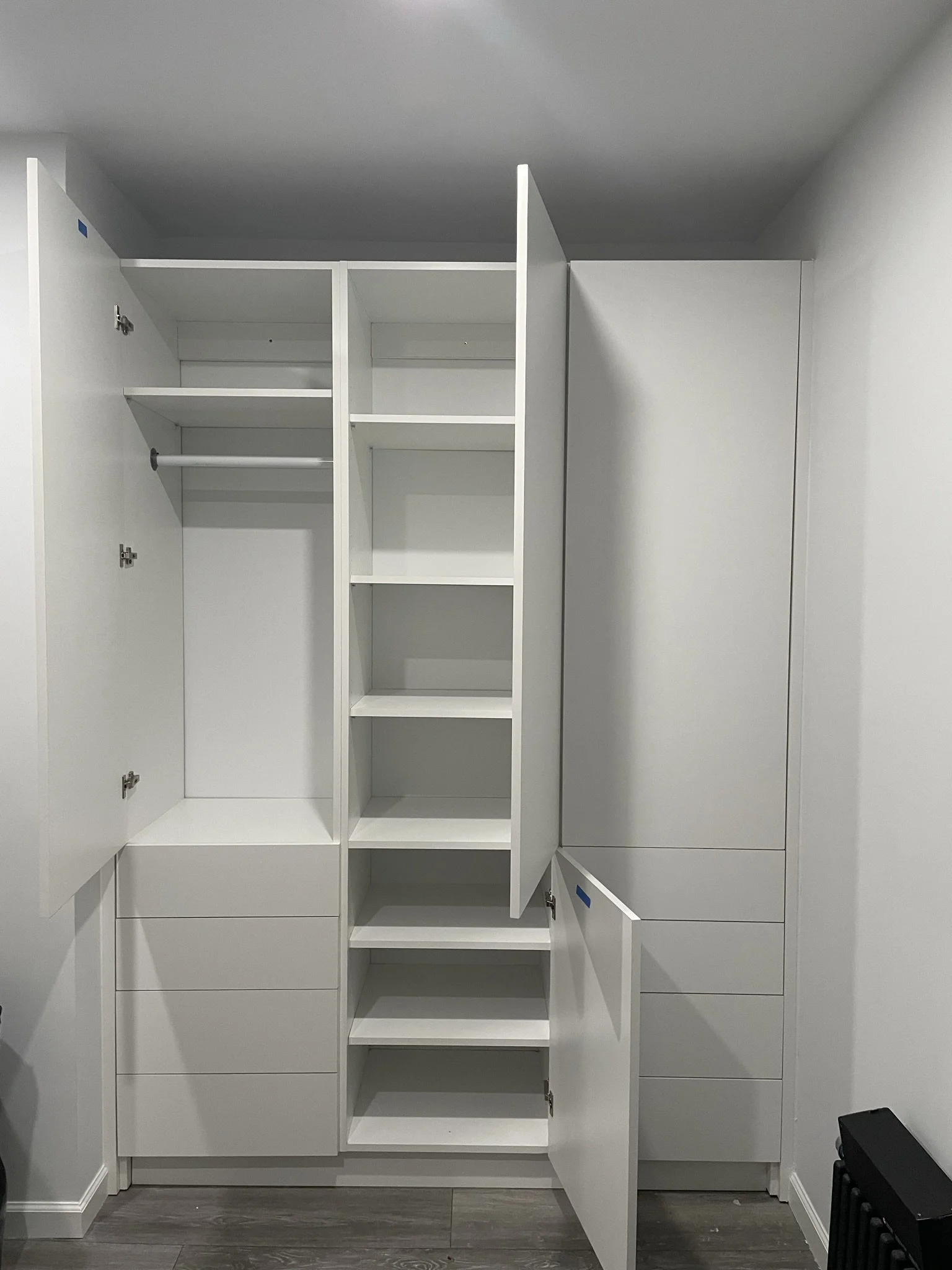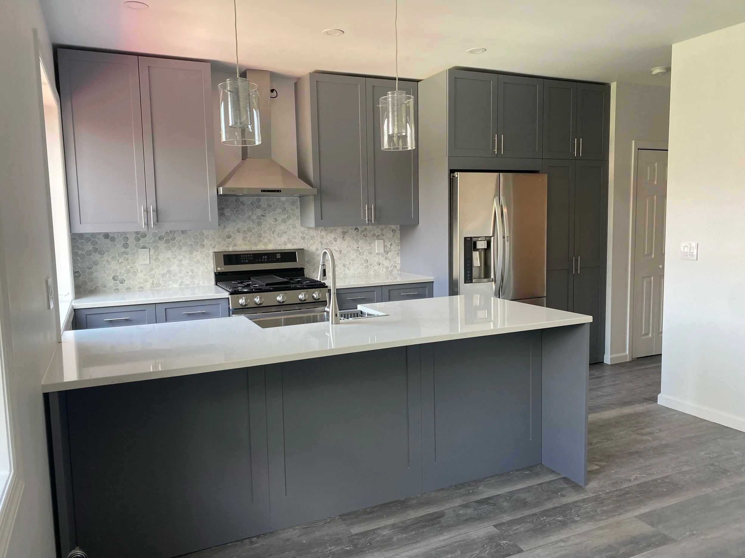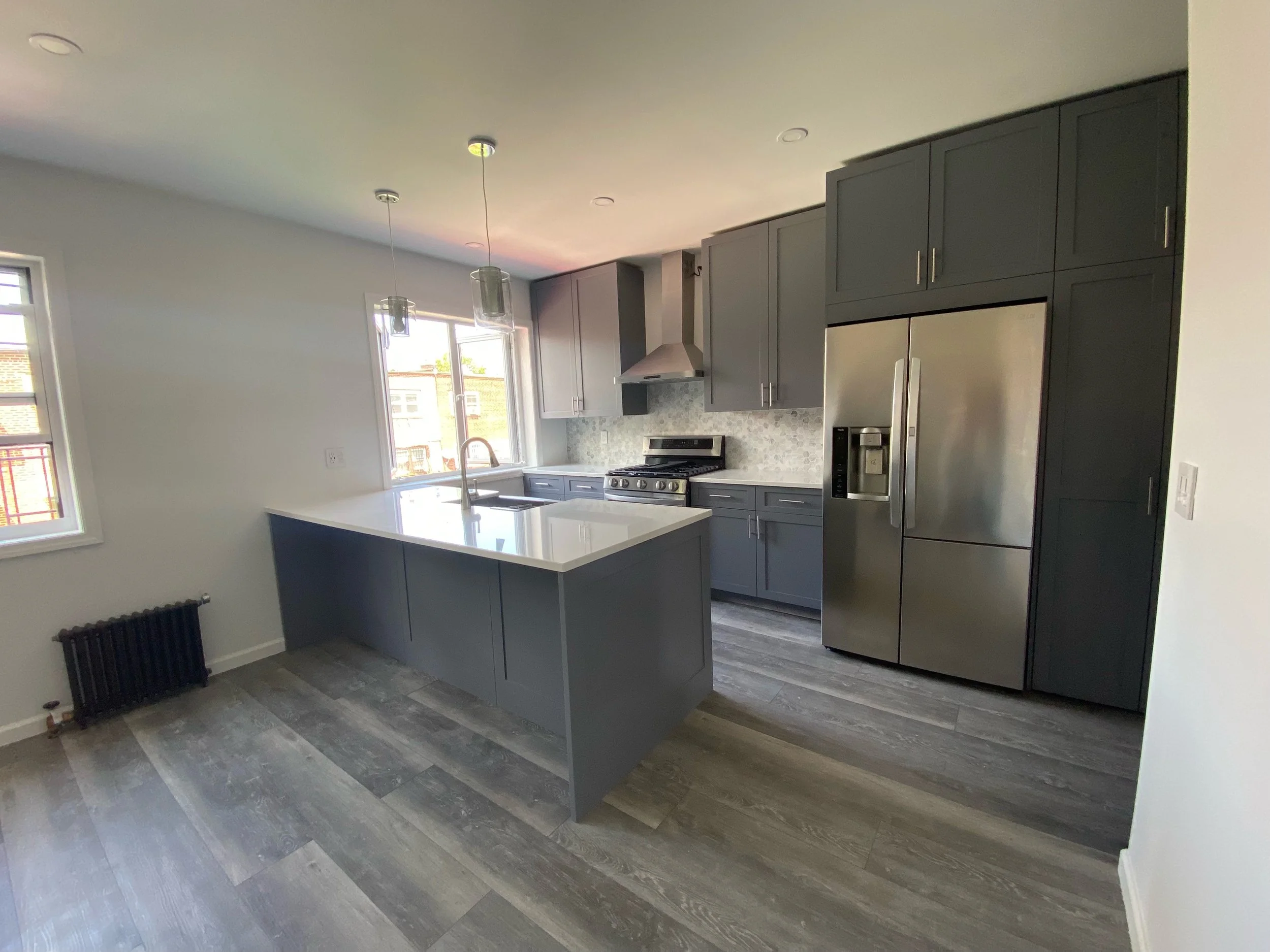 The renovation of the second-floor apartment in queens consisted of a gut renovation with the addition of custom closets and kitchen cabinets / island. The scope of work consisted of demolishing pre-existing floor plan and setting a new plan layout. This 2-bedroom apt expanded to a 2 bedroom with a home office and open concept kitchen- living room area with 1.5 bathrooms. This project was finished with a beautiful modern aesthetic and grey tone vinyl flooring.